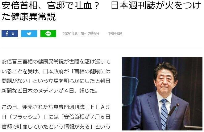 安倍首相「吐血説」を報じる中央日報(2020年8月5日付)